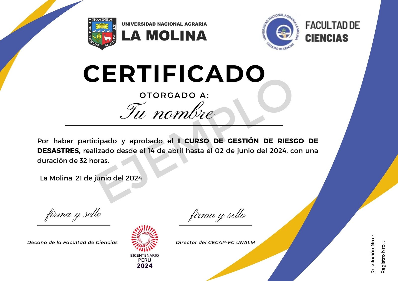 Al haber aprobado el Curso con un promedio ponderado no menor a 14 se le otorga al participante un Certificado a nombre de la Universidad Nacional Agraria La Molina, de la Facultad de Ciencias.
